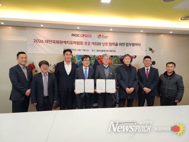 뉴스펀치 김길룡 기자 | 태안국제원예치유박람회 조직위원회는 12월 17일 서울 키자니아 본사에서 글로벌 어린이 직업체험 브랜드 키자니아 운영사인 ㈜엠비씨플레이비와 업무협약을 체결했다고 밝혔다. 이번 협약은 '2026 태안국제원예치유박람회' 개최를 앞두고 어린이와 가족 단위 관람객 유입을 확대하고, 체험 중심의 박람회 콘텐츠를 강화하기 위해 추진됐다.