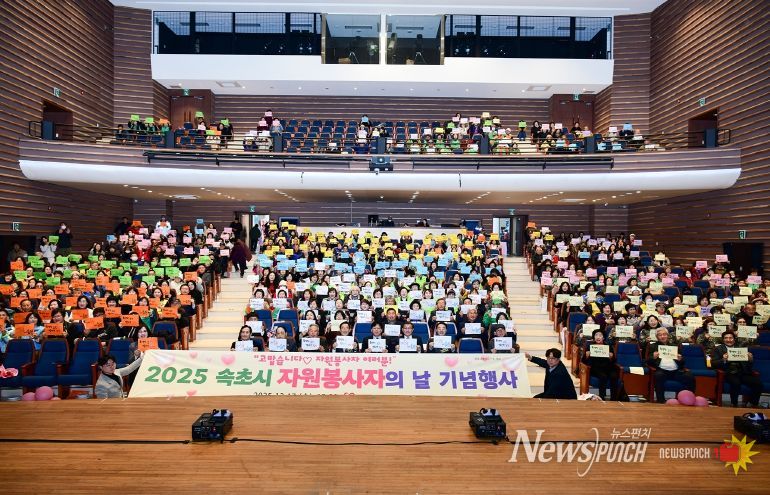 뉴스펀치 김길룡 기자 | 속초시자원봉사센터(센터장 하종수)는 17일 속초문화예술회관에서 650여명의 자원봉사자가 참석한 가운데 ‘2025년 속초시자원봉사자의 날 기념행사’를 성황리에 개최했다.