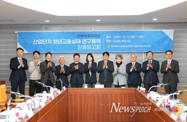 뉴스펀치 김길룡 기자 | 전북특별자치도의회 의원 연구단체 ‘기업하기 좋은 전북’(대표위원 서난이)은 15일 도의회 세미나실에서 ‘전북 산업단지 청년 고용실태 연구’ 최종보고회를 열고, 지역 산업단지의 청년 고용 여건과 구조적 한계를 진단하고 정책 대안을 제시했다.