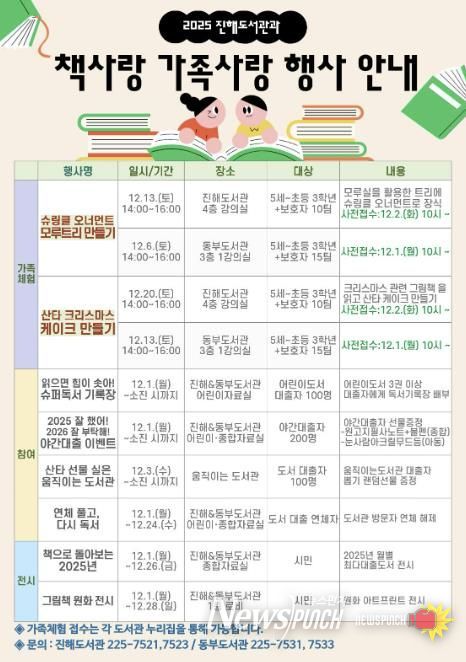 뉴스펀치 김길룡 기자 | 창원특례시 진해도서관과는 연말을 맞아 가족과 함께 즐길 수 있는 따뜻하고 풍성한 ‘2025 책사랑 가족사랑 행사’를 진해도서관 및 동부도서관에서 12월 한 달간 운영한다.