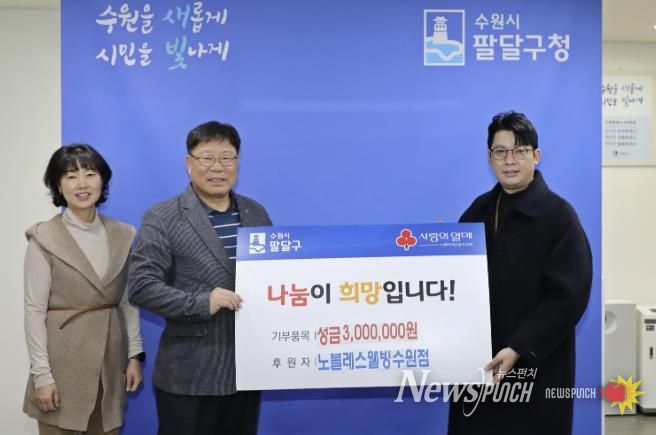 뉴스펀치 김길룡 기자 | 수원시 팔달구은 지난 17일, 노블레스웰빙 수원점(대표 김현수)에서 팔달구청을 방문하여 관내 저소득층을 위한 성금을 전달했다고 밝혔다.