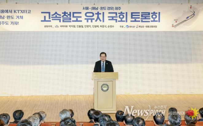 '서울~해남·완도 경유 제주 고속철도 유치 국회 토론회'는 지역구 국회의원인 박지원 의원을 주축으로 민홍철, 민병덕, 민형배, 허종식, 손명수 국회의원이 공동 주최하고 완도군과 해남군이 공동으로 주관했다.