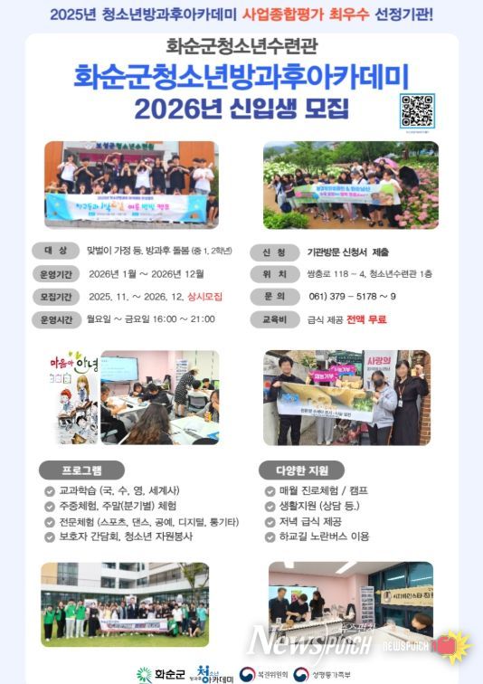 뉴스펀치 김길룡 기자 | 화순군은 오는 19일부터 청소년수련관에서 방과후아카데미 신입생을 모집한다고 밝혔다.