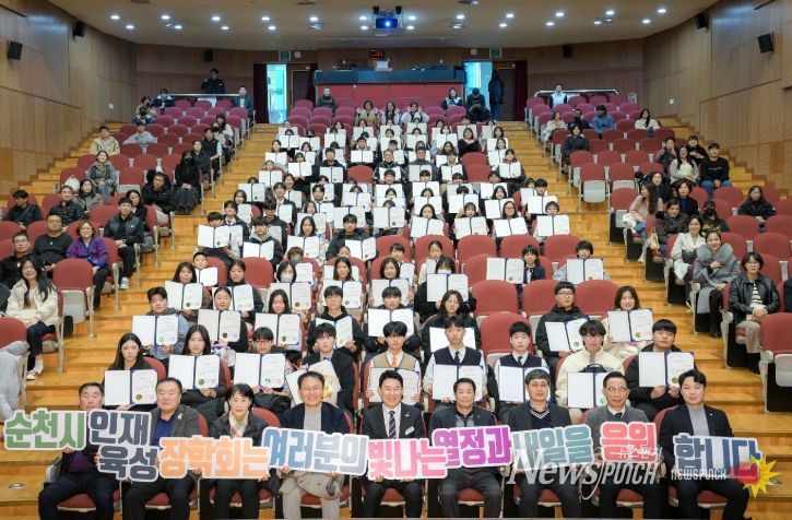 뉴스펀치 김길룡 기자 | 재단법인 순천시인재육성장학회는 지난 18일 문화건강센터 다목적홀에서 2025년 장학증서 전달식을 가졌다.