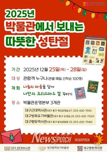 뉴스펀치 조평훈 기자 | 대구문화예술진흥원 박물관운영본부 소속 대구 시립 3개 박물관(대구근대역사관·대구방짜유기박물관·대구향토역사관)에서는 성탄절을 맞아, 12월 25일부터 28일까지 관람객을 대상으로 ‘2025년 박물관에서 보내는 따뜻한 성탄절 –나만의 크리스마스 씰 꾸미기-’ 문화행사를 진행한다.