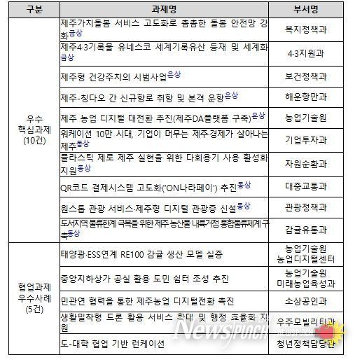 이 가운데 상위 5개 과제가 이날 발표 심사를 거쳐 최종 순위를 가렸으며, ‘제주4·3기록물 유네스코 세계기록유산 등재 및 세계화’와 ‘제주가치돌봄 서비스 고도화로 촘촘한 돌봄 안전망 강화’ 과제가 금상을 차지했다.
