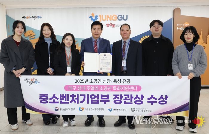 뉴스펀치 조평훈 기자 | 대구 중구 산하 도심재생문화재단이 운영하는 주얼리 소공인특화지원센터는 지난 17일 대전 호텔ICC에서 열린 ‘2025 소공인 성과대회’에서 소공인 경쟁력 강화와 지역 경제 활성화에 기여한 공로를 인정받아 중소벤처기업부 장관상을 수상했다.