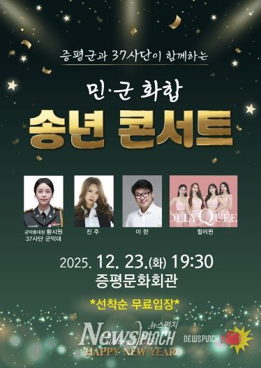 뉴스펀치 김길룡 기자 | 충북 증평군은 오는 12월 23일 오후 7시 30분, 증평문화회관에서 민과 군(軍이) 함께 어우러지는‘민·군화합 송년콘서트’를 개최한다.