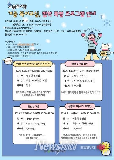 뉴스펀치 김길룡 기자 | 청주오송도서관 권역 내 7개관(오송·서원·흥덕·신율봉·강내·옥산·가로수)은 겨울방학을 맞아 독서교실 및 방학 특별프로그램 수강생을 모집한다.
