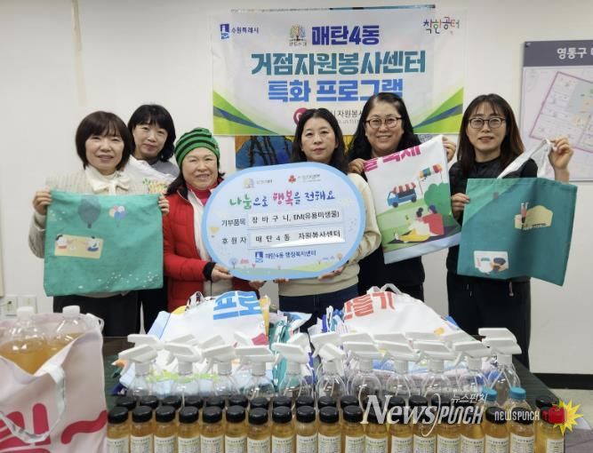 뉴스펀치 김길룡 기자 | 수원시 매탄4동 자원봉사캠프 코치와 봉사회원들은 지난 12월 19일, 지역 상권 활성화와 마을 공동체 활성화를 위해 회원들이 직접 만든 장바구니와 EM(유용 미생물)을 매탄4동 행정복지센터에 전달했다.