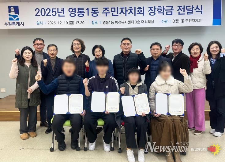 뉴스펀치 김길룡 기자 | 수원시 영통구 영통1동 주민자치회는 지난 19일, 지역의 미래를 이끌어갈 우수한 인재들을 격려하기 위해 ‘꿈과 희망의 장학사업’을 실시했다.
