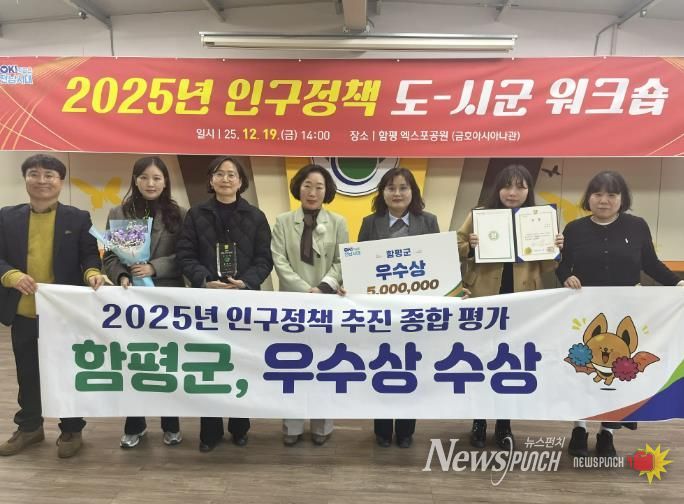 뉴스펀치 김길룡 기자 | 전남 함평군의 지속적인 정주 여건 개선 노력이 인구정책 종합평가 우수상 수상으로 이어졌다.