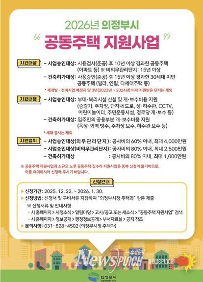 뉴스펀치 김길룡 기자 | 의정부시는 노후 공동주택의 관리비용 부담 완화와 주거환경 개선을 위해 내년 1월 30일까지 ‘2026년 공동주택 지원사업’ 신청을 받는다.