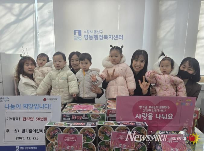 뉴스펀치 김길룡 기자 | 지난 22일 별가람어린이집에서는 연말연시를 맞이하여 이웃 돕기 후원 물품 컵라면 50 상자를 평동 행정복지센터에 전달했다.
