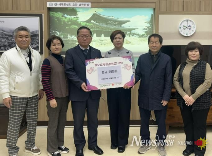 뉴스펀치 김길룡 기자 | 광주시 남한산성면 생활개선회는 22일 남한산성면 행정복지센터를 방문해 이웃돕기 성금 50만 원을 기탁했다.