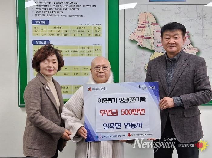 뉴스펀치 김길룡 기자 | 일죽면 행정복지센터는 지난 19일, 안성시 일죽면 화봉리에 위치한 연등사에서 저출산 가구 지원을 위해 500만 원의 기부금을 전달했다. 이번 기부는 지역 내 저출산 문제 해결과 아이 양육에 어려움을 겪는 가정을 돕기 위한 뜻깊은 자리로 마련됐다.