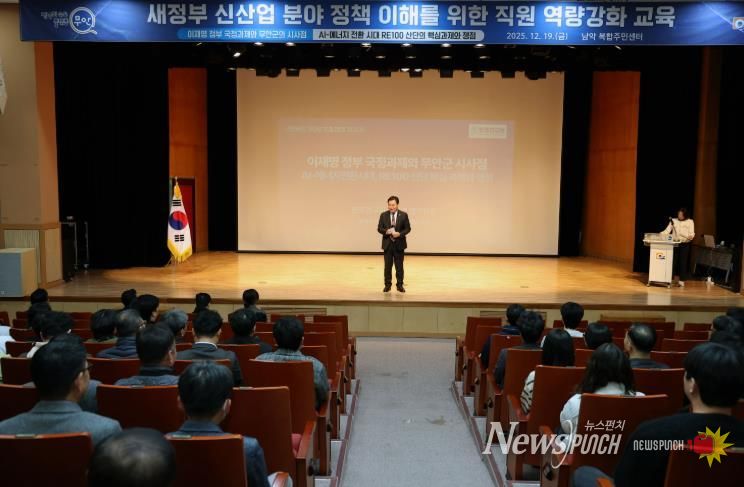 뉴스펀치 김길룡 기자 | 무안군은 지난 19일 남악 복합주민센터 대강당에서 이재명 정부가 국가 신성장 동력으로 육성하고 있는 에너지, AI 등 신산업 분야에 대한 정부 국정과제와 최근 정책 동향에 대한 이해도를 높이기 위해 무안군 공직자들을 대상으로 역량 강화 교육을 실시했다.