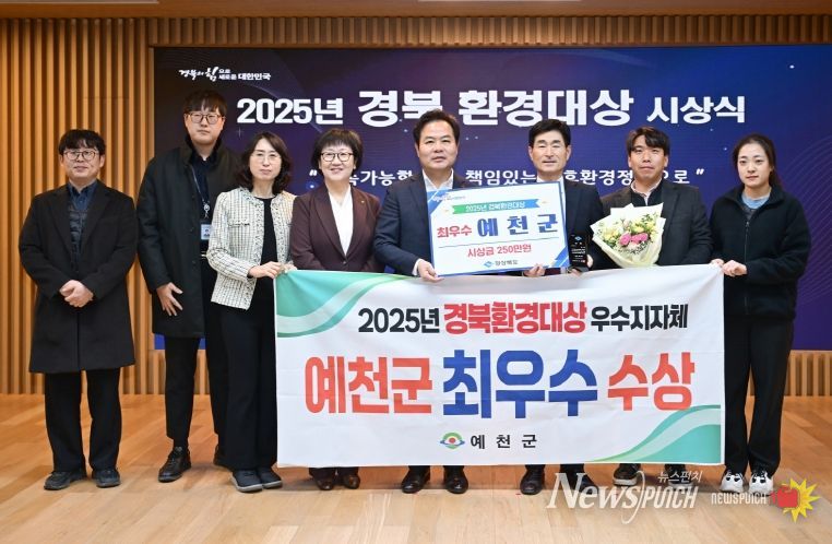뉴스펀치 김길룡 기자 | 예천군은 22일 경상북도 주관 ‘2025년 경북환경대상’ 평가에서 최우수상을 수상하며 환경 전반에 걸친 우수한 정책 추진 성과를 인정받았다.