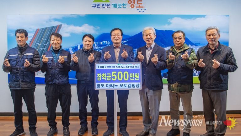 뉴스펀치 김길룡 기자 | 영도 마리노 오토캠핑장(기간제근로자 일동)은 지난 12월 19일 영도구청을 방문하여 우수한 지역인재 양성을 위해 (재)행복영도장학회에 500만 원을 기탁했다.
