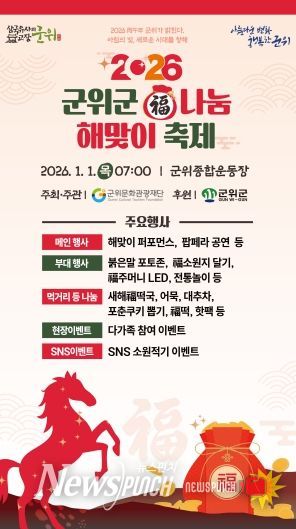 뉴스펀치 김길룡 기자 | 대구광역시 군위군은 다가오는 2026년 병오년(丙午年) 새해를 맞아 군민의 행복과 안녕을 기원하는 '2026 군위군 복나눔 해맞이 축제'를 오는 1월 1일 오전 7시부터 군위종합운동장에서 개최한다.