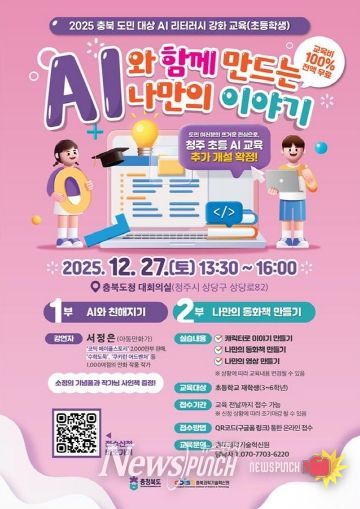 뉴스펀치 김길룡 기자 | 충청북도는 오는 12월 27일 13:30 충북도청 대회의실에서 도내 초등학생(3~6학년)과 학부모 200여명을 대상으로 ‘AI 웹툰 교육(중부권 2차)’을 진행한다고 밝혔다. 이번 교육은 북부권(충주), 남부권(옥천), 중부권 1차(청주)에 이어 2025년 마지막으로 개최되는 도내 AI 창작 체험 프로그램이다.