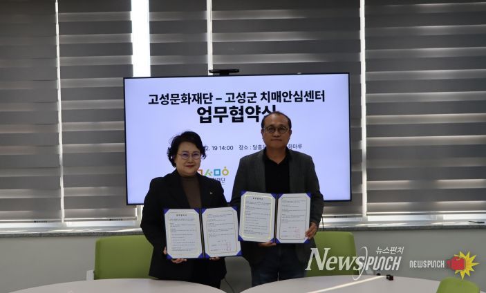 뉴스펀치 김길룡 기자 | 고성문화재단(이사장 함명준)은 지난 12월 19일, 달홀문화센터에서 고성군 치매안심센터와 치매 어르신 문화예술 치유·향유 환경 조성을 위한 업무협약(MOU)을 체결했다.