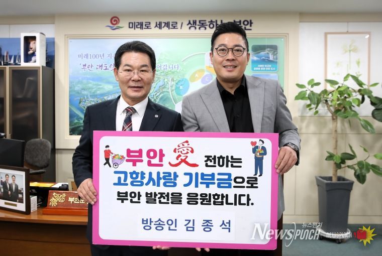 뉴스펀치 정홍균 기자 | 부안군은 부안 출신 방송인 김종석씨가 2023년에 이어 2025년에도 고향사랑기부금 100만원을 기탁했다고 밝혔다.