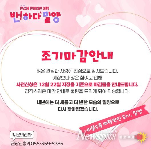 뉴스펀치 김길룡 기자 | 경남 밀양시는 ‘반하다밀양 반값여행’ 환급(페이백) 행사 사전 신청을 22일 자정 기준으로 조기 마감한다고 전했다. 크리스마스와 연말 연초를 앞두고 신청이 급증하면서 잔여 예산이 예상보다 빠르게 소진될 것으로 판단돼 접수 종료를 결정했다는 설명이다.