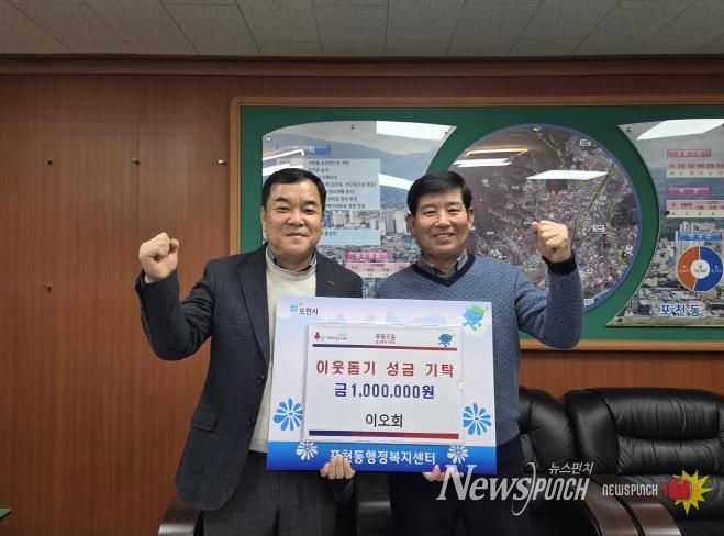 뉴스펀치 김길룡 기자 | 포천동 행정복지센터는 지난 22일 이오회가 포천동 내 어려운 이웃을 돕기 위해 성금 100만 원을 기탁했다고 밝혔다.