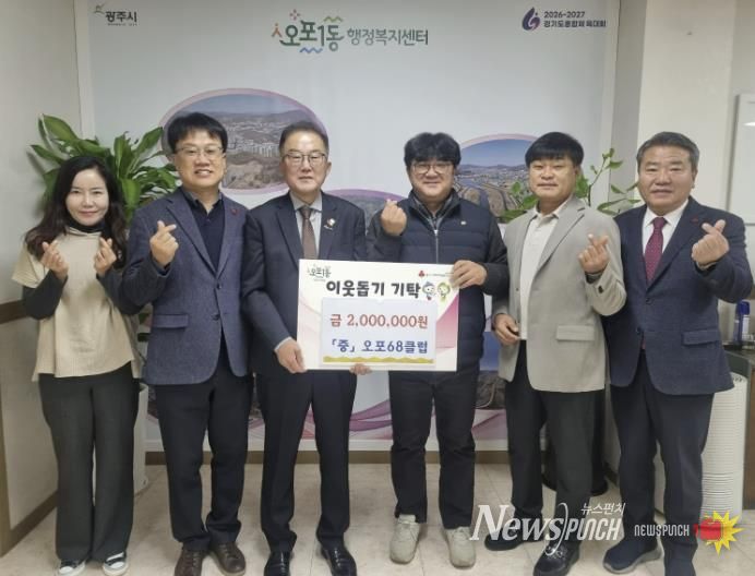 오포68클럽은 지역사랑 봉사 활동을 목적으로 오포 권역 내 1968년생을 주축으로 2004년 결성된 친목 단체다. 이번에 기탁된 성금은 오포 권역 4개 동(오포1·2동, 능평동, 신현동)의 취약계층을 지원하는 데 사용될 예정이다.