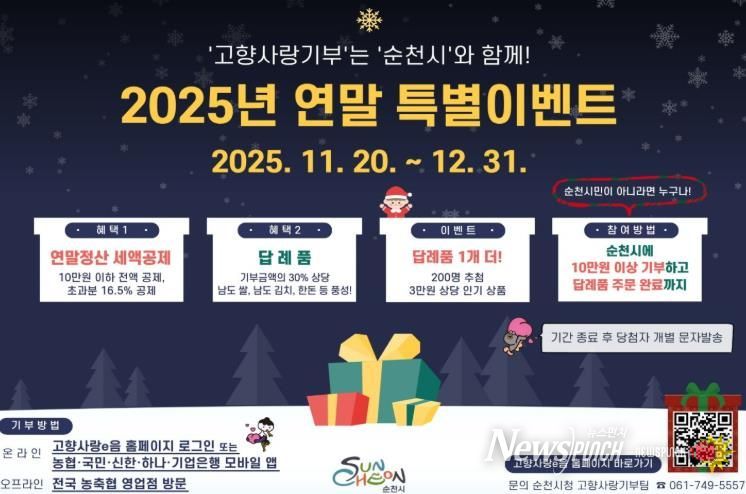 뉴스펀치 김길룡 기자 | 순천시가 고향사랑기부제 활성화와 연말정산 혜택을 위해 실시 중인 ‘고향사랑기부제 연말 특별이벤트’ 홍보에 나섰다.