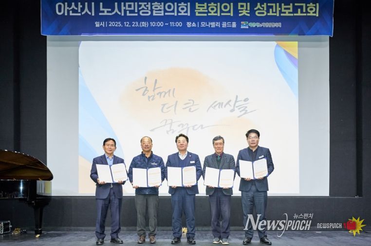 뉴스펀치 김길룡 기자 | 아산시 노사민정협의회(위원장 오세현 시장)는 23일 모나밸리에서 협의회 위원과 기업 관계자 등 100여 명이 참석한 가운데 ‘2025 아산시 노사민정협의회 성과보고회’를 열고, 올해 협력사업 성과를 공유했다.