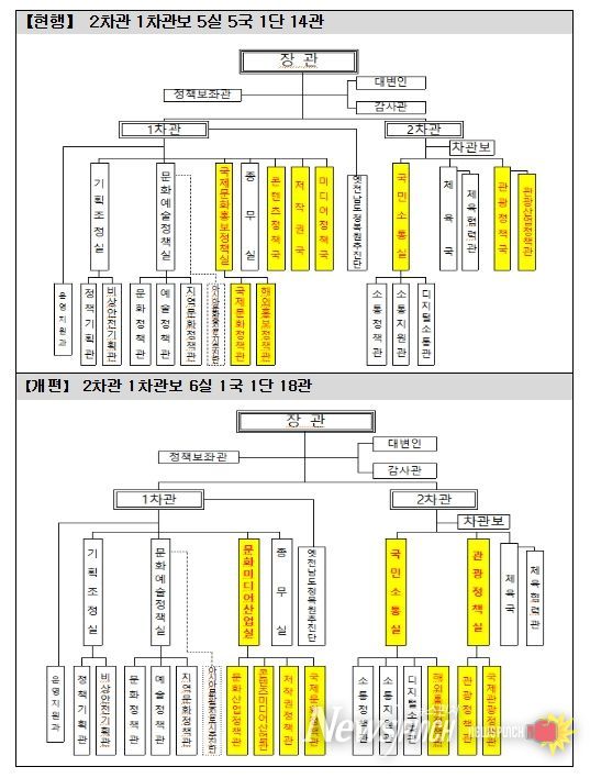 ‘문화미디어산업실’ 내의 콘텐츠정책국과 미디어정책국을 개편해 ‘지식재산(IP)-인력-자금-연구개발(R&D)’ 등 콘텐츠산업의 4대 성장 기반을 중점적으로 지원하는 문화산업정책관을 두고, 미디어·영화·게임·대중음악·출판 등 핵심 분야 지원 기능은 ‘콘텐츠미디어산업관’으로 일원화해 개별 산업 내 쟁점에 대해서도 신속히 대응할 계획이다.