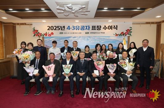 뉴스펀치 김길룡 기자 | 진명기 행정부지사는 23일 오전 10시30분 도청 백록홀에서 ‘2025년도 4·3유공자 표창 수여식’을 개최하고 제주4·3진상규명 및 4·3희생자 및 유족 명예회복 등에 기여한 도민과 공무원 22명에게 도지사 표창을 수여했다.