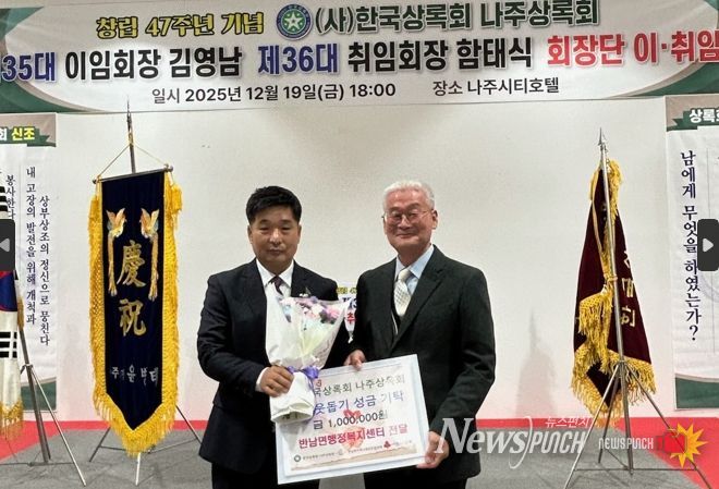 뉴스펀치 김길룡 기자 | (사)한국상록회 나주상록회는 창립 47주년을 맞아 지난 19일 나주시 반남면 지역사회보장협의체에 성금 100만 원을 기탁했다고 밝혔다.