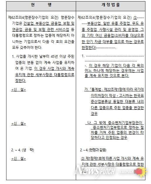 이에 따라 개정안은 일부 유흥·사행성 업종 등 일부를 제외하고, 건설업, 금융업, 보험업 등도 신청이 가능하도록 개선했다. 이를 통해 다양한 분야에서 모범적인 명문장수기업을 발굴할 수 있을 것으로 기대된다.