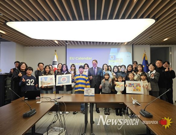 뉴스펀치 김길룡 기자 | 고성군은 12월 23일 화요일 오후 1시, 서울 중구 서울스퀘어 11층에 위치한 주한 유럽연합(EU) 대표부에서 열린 '2025년 주한 유럽연합 학생 달력 그림 공모전 시상식'에 수상 학생들을 인솔해 참석했다.