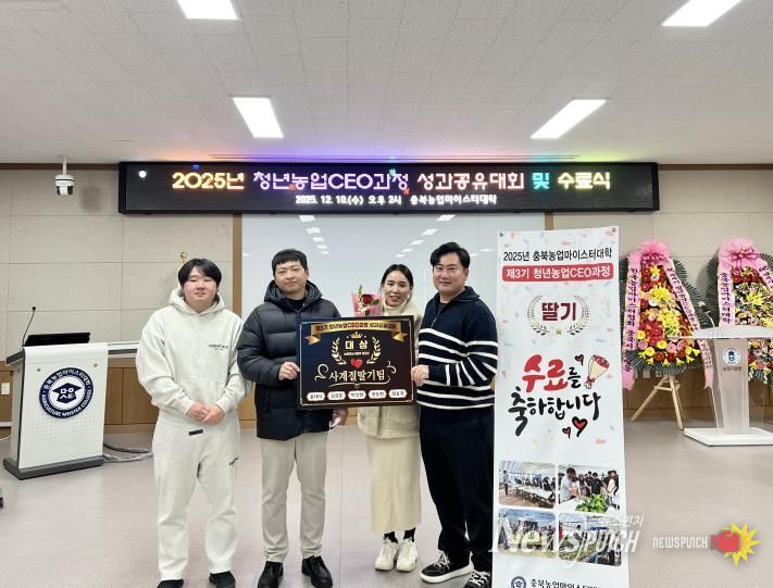뉴스펀치 김길룡 기자 | 충주시농업기술센터 청년창업농 실습 교육생 출신으로 구성된‘사계절 딸기’팀이 제3기 청년농업CEO과정 성과공유대회에서 대상 수상의 영광을 안았다.