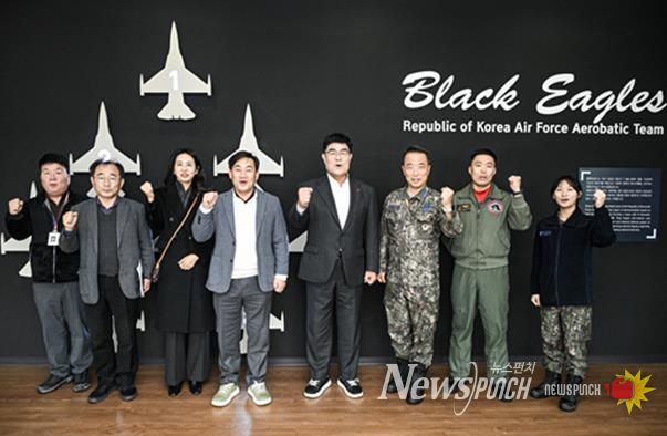 뉴스펀치 김길룡 기자 | 삼척관광문화재단이 삼척의 주요 축제에서 화려한 에어쇼로 시민과 관광객들에게 잊지 못할 감동을 선사한 대한민국 공군 특수비행팀 ‘블랙이글스’를 직접 찾아 감사의 뜻을 전했다.