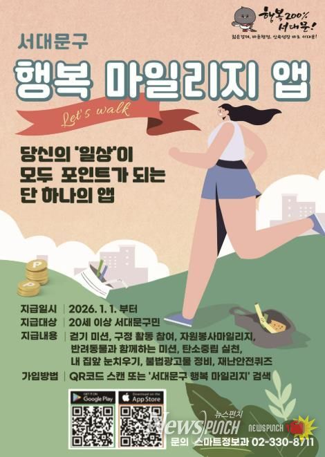 뉴스펀치 김완규 기자 | 서대문구는 1월 1일 새해부터 ‘서대문구 행복 마일리지 앱’을 통해 20세 이상 구민을 대상으로 본격적인 포인트 지급에 나선다고 24일 밝혔다.