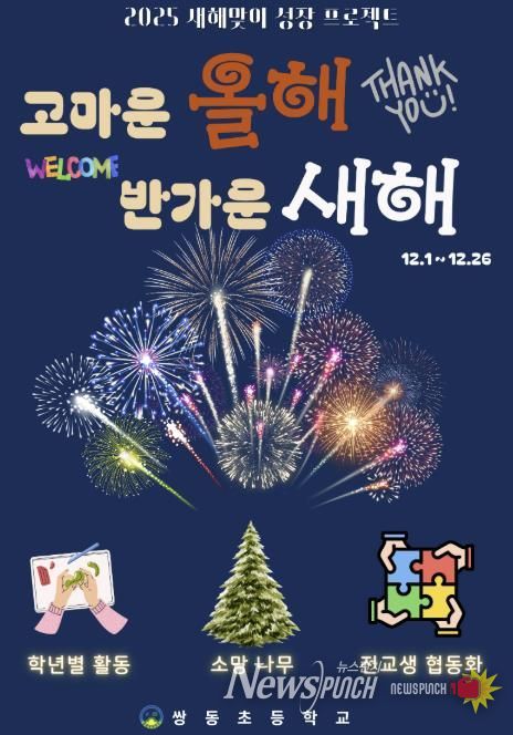 뉴스펀치 김길룡 기자 | 쌍동초등학교는 연말연시를 맞아 전교생이 참여하는 ‘고마운 올해, 반가운 새해’ 새해맞이 성장 프로젝트를 진행했다. 학생들은 한 해를 돌아보고 감사의 마음을 표현하며, 새해 목표를 시각적으로 드러내는 다양한 활동을 경험했다.