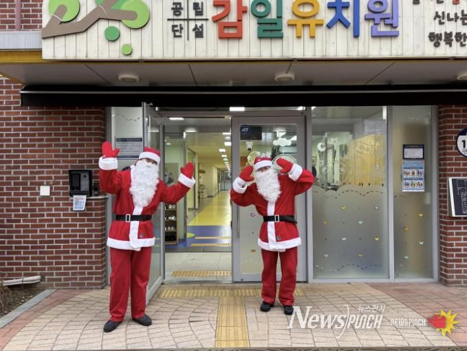 뉴스펀치 김길룡 기자 | 감일유치원에서 성탄절을 맞아 특별한 등원 행사가 진행돼 눈길을 끌었다.