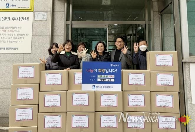 뉴스펀치 김길룡 기자 | 매탄3동 행복한교회는 지난 23일 크리스마스를 맞아 지역 내 어려운 이웃을 위해 생필품 박스 20개를 매탄3동 행정복지센터에 기탁했다.