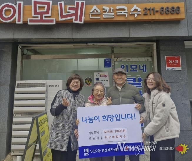 뉴스펀치 김길룡 기자 | 수원시 팔달구 우만2동은 지난 23일, 이모네칼국수와 함께 이웃나눔 후원금 전달식을 진행했다고 밝혔다.