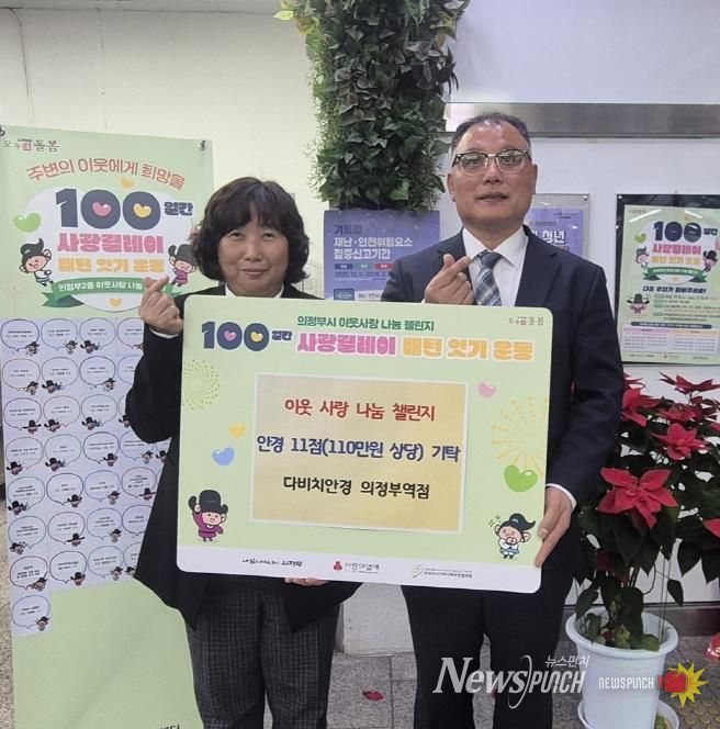 뉴스펀치 김길룡 기자 | 의정부시 의정부2동주민센터는 12월 23일 다비치안경 의정부역점이 ‘100일간 사랑릴레이 배턴 잇기’에 동참해 취약계층을 위한 안경 11점(110만 원 상당)을 기부했다고 밝혔다.
