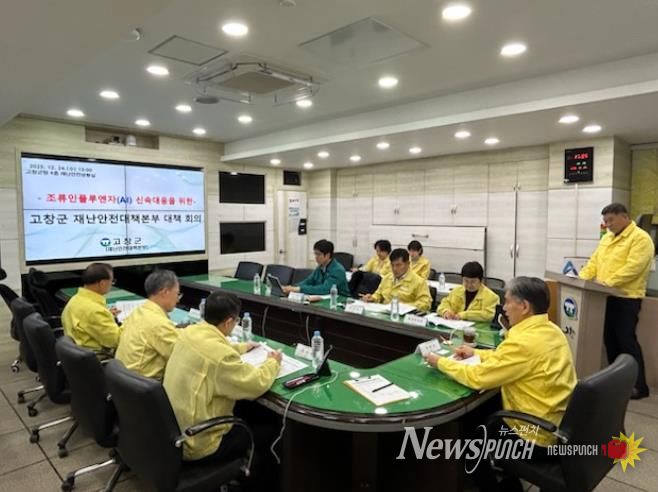 뉴스펀치 김길룡 기자 | 고창군이 24일 김영식 부군수주재로 군청 재난안전상황실에서 행정안전부와 함께 재난안전대책본부 회의를 열고, 고병원성 조류인플루엔자(AI) 확산 방지를 위한 방역관리 상황을 점검했다.