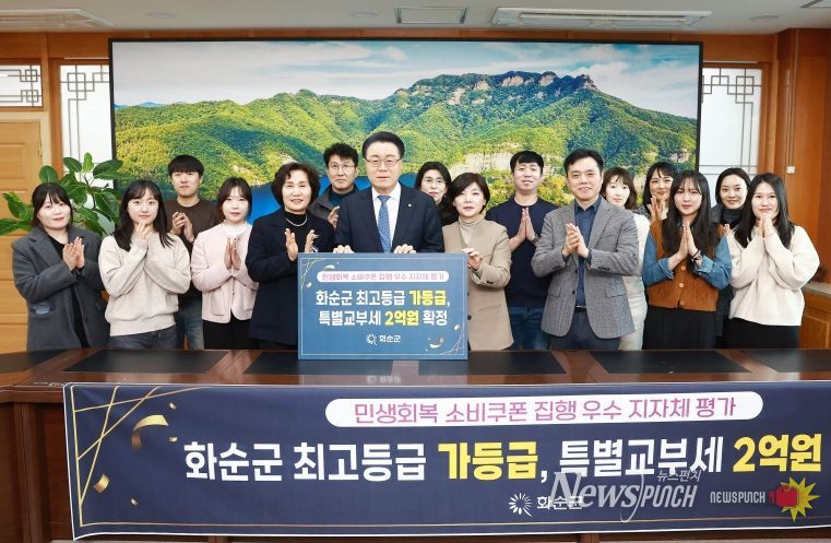 뉴스펀치 김길룡 기자 | 화순군은 24일 행정안전부가 주관한 ‘민생회복 소비쿠폰 집행 우수 지자체 평가’에서 최우수 지자체로 선정돼 특별교부세 2억 원을 확보했다고 밝혔다.
