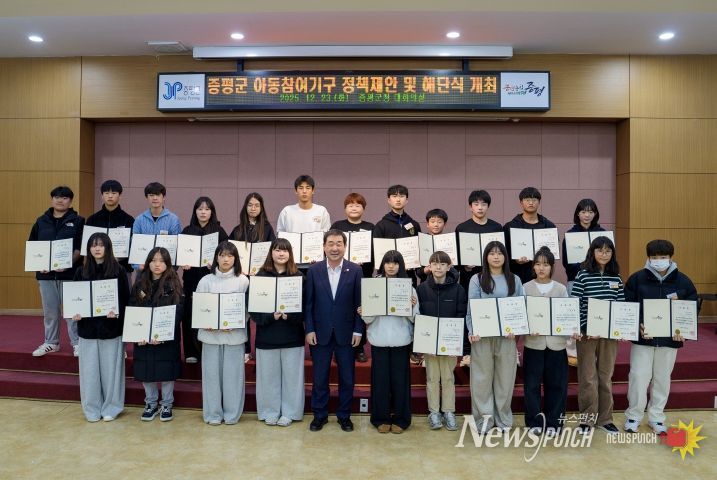 뉴스펀치 김길룡 기자 | 충북 증평군은 지난 23일 군청 대회의실에서 ‘2025년 아동참여기구 해단식’을 열고, 아동의 참여권 보장과 아동친화적 정책 실현을 위해 운영해 온 아동참여기구 활동을 마무리했다.