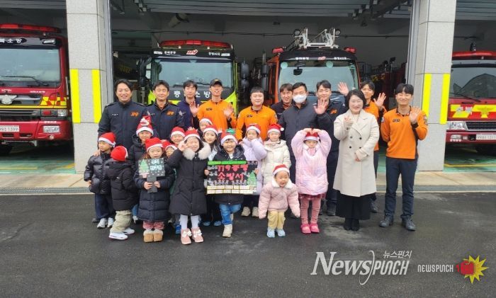뉴스펀치 김길룡 기자 | 충북 증평 홍익어린이집(원장 김민지) 원아들이 연말을 맞아 지역 소방관들에게 따뜻한 감사의 마음을 전했다.