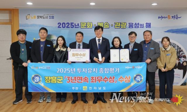 이번 평가는 전남도 22개 시·군을 대상으로 투자유치 실적, 유치 여건 조성, 일반 행정 등의 실적을 평가해 선정했으며 장흥군은 ‘2023년, 2024년 최우수상’에 이어 3년 연속 수상의 영예를 안았다.